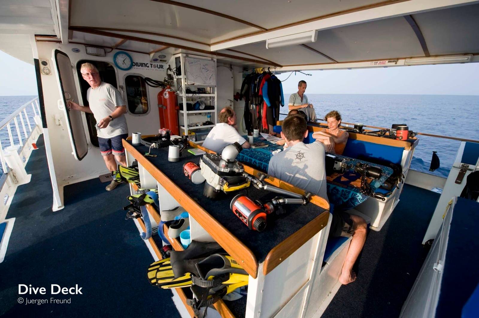 Nitrox is available on board, and the entire crew is extremely professional handling all dive gear and cameras. A small outboard is always on standby when diving starts, and on most dives the crew places a mermaid line to facilitate the descent and ascent for divers. Photographers are warmly welcomed and often guided to interesting species and sights. The multiple and updated ID books and literature on board makes it always possible to find out what you have just seen.